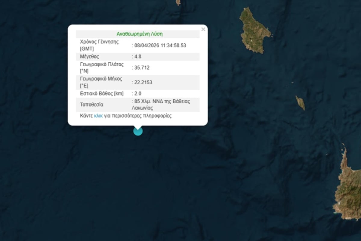 Το μεσημέρι της Τετάρτης 8 Απριλίου, πραγματοποιήθηκε σεισμός στην Λακωνία των 4,8 ρίχτερ και προκάλεσε αναστάτωση. Βάσει επίσημων πληροφοριών, το επίκεντρο του σεισμού εντοπίζεται στον θαλάσσιο χώρο 85 χιλιόμετρα νότια –νοτιοδυτικά της Βάθειας Λακωνίας. Άξιο συζήτησης της συγκεκριμένης σεισμικής δόνησης είναι το γεγονός πως αποτελεί έναν εξαιρετικά επιφανειακό σεισμό.