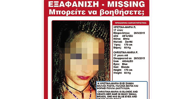 Αίσια έκβαση είχε η υπόθεση εξαφάνισης της ανήλικης είχε χαθεί από το σπίτι της στο Αιγάλεω την περασμένη εβδομάδα. Η 17χρονη Χριστίνα εντοπίστηκε τελικά την Παρασκευή από τους αστυνομικούς της Δίωξης Ηλεκτρονικού Εγκλήματος στη Νάουσα, όπου -όπως όλα δείχνουν- είχε καταφύγει με τον φίλο της.