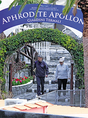 Στο δωμάτιό της την περίμεναν λουλούδια και ένα καλάθι με τα τυπικά προϊόντα του νησιού, δώρο από τον δήμο Σεράρα Φοντάνα. Ξεκουράστηκε το βράδυ και το πρωί της Κυριακής δεν έχασε χρόνο και πήγε στο κέντρο ευεξίας «Aphrodite Apollon», που είναι ξακουστό για τα ιαματικά λουτρά του και τις φροντίδες χαλάρωσης.