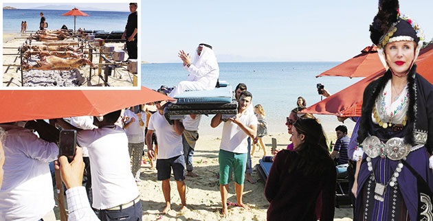 Κι ενώ η τσίκνα απλωνόταν πάνω από την παραλία, ένας… σεΐχης έκανε την εμφάνισή του με ταχύπλοο. Τέσσερις γεροδεμένοι άνδρες τον περίμεναν προκειμένου να τον μεταφέρουν στον χώρο των εορταστικών εκδηλώσεων κουβαλώντας τον μάλιστα πάνω σε μια ξαπλώστρα. Οσοι έγιναν μάρτυρες της άφιξης του… Σαουδάραβα ξέσπασαν σε γέλια και χειροκροτήματα, αφού γρήγορα κατάλαβαν πως επρόκειτο για happening που οργάνωσε ο Ζαννής Φραντζέσκος, ένας εκ των ιδιοκτητών του Nammos, ο οποίος συνηθίζει να εκπλήσσει τους πελάτες του με διάφορα χαριτωμένα events.