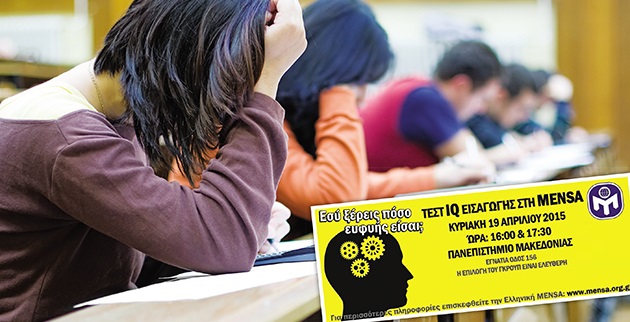Σκληρή μάχη για να διαπιστωθεί εάν οι διαγωνιζόμενοι που θα κλειστούν για λίγη ώρα σε μια αίθουσα στο Πανεπιστήμιο Μακεδονίας βρίσκονται στο 2% του ανθρώπινου πληθυσμού που διαθέτει υψηλό δείκτη νοημοσύνης αναμένεται να δοθεί την Κυριακή στη Θεσσαλονίκη! Πρόκειται για το ομαδικό τεστ IQ, το οποίο θα κρίνει ποιοι θα είναι τα επόμενα δυνατά μυαλά, μέλη της MENSA, της διεθνούς ομάδας που απαρτίζεται από άτομα με αξιοζήλευτο δείκτη νοημοσύνης. Το ομαδικό τεστ θα διεξαχθεί στη Θεσσαλονίκη την Κυριακή 19 Απριλίου, στις 16.00 και στις 17.30, στο αμφιθέατρο 3 του Πανεπιστημίου Μακεδονίας. Τα τεστ απευθύνονται σε παιδιά 10 έως 14 ετών και άτομα άνω των 14 ετών.