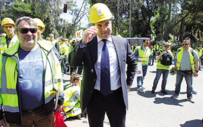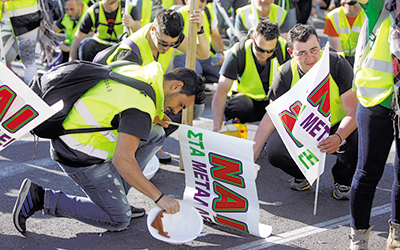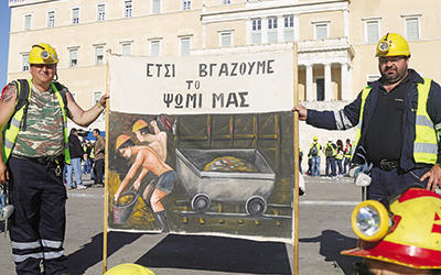 Με «παρέλαση» στους κεντρικούς δρόμους της Αθήνας, συρτάκι, εμβατήρια και μελωδίες του Θεοδωράκη έντυσαν χθες την… απόβασή τους στην πρωτεύουσα οι μεταλλωρύχοι. Το κέντρο της πόλης παρέλυσε από νωρίς το πρωί. Χτυπώντας ρυθμικά τα κράνη τους και φωνάζοντας συνθήματα όπως «Εργατιά, ενωμένη σαν γροθιά» και «Κάτω τα χέρια από τα μεταλλεία», οι διαδηλωτές συγκεντρώθηκαν αρχικά έξω από το υπουργείο Παραγωγικής Ανασυγκρότησης, Περιβάλλοντος και Ενέργειας (ΥΠΑΠΕΝ) και στη συνέχεια κατευθύνθηκαν προς τη Βουλή υποχρεώνοντας την Αστυνομία να διακόψει διαδοχικά την κυκλοφορία στα δύο ρεύματα της Μεσογείων, στη Βασιλίσσης Σοφίας και αλλού.