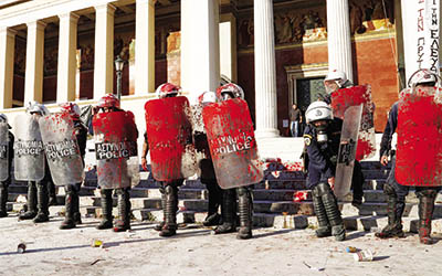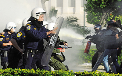Οι ταραξίες πέταξαν πέτρες, αντικείμενα και μπογιές! Μάλιστα οι ρόλοι έμοιαζαν να έχουν… αντιστραφεί, αφού έσπευσαν ακόμη και να «ψεκάσουν» με πυροσβεστήρες τους αστυνομικούς, οι οποίοι απάντησαν αμέσως με χρήση δακρυγόνων και χειροβομβίδες κρότου λάμψης. Στη συνέχεια οι αστυνομικές δυνάμεις προώθησαν τους διαδηλωτές προς την Ομόνοια και τα Εξάρχεια, για πρώτη φορά έπειτα από καιρό, με συμμετοχή της Ομάδας ΔΕΛΤΑ και αντρών των ΜΑΤ. Μία μικρή ομάδα ατόμων παρέμεινε στην πλατεία Εξαρχείων αρκετή ώρα και άναψε φωτιές σε δύο κάδους, ενώ πέταξε πέτρες και βόμβες μολότοφ εναντίον των αστυνομικών στην οδό Στουρνάρη, χωρίς να κλιμακωθεί περισσότερο η κατάσταση.