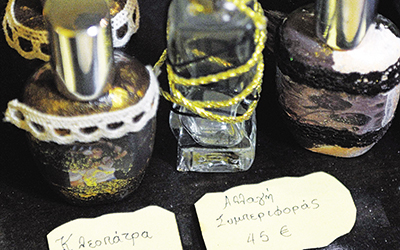 Αυτό που ζητάει περισσότερο από εκείνην η πελατεία της, ανεξαρτήτως φύλου, είναι κυρίως να αγοράσουν ερωτικά φίλτρα, για τα οποία μάλιστα διαθέτουν διόλου ευκαταφρόνητα ποσά (45 ευρώ για ένα μπουκαλάκι κτλ).