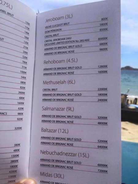 Ενδεικτικά, η πιο φθηνή τιμή είναι 3.000 ευρώ για να πιεί κανείς 3 λίτρα veuve slicquot brut ενώ η πιο υψηλή, είναι 80.000 ευρώ για cristal jeroboam του 2002 (exclusive limited edition).