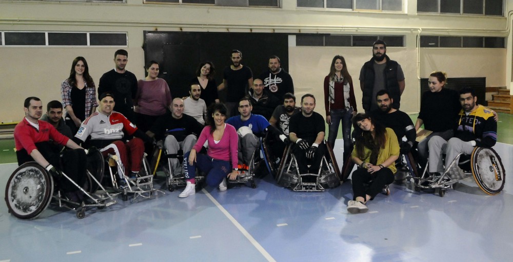 Δύο με τρεις φορές την εβδομάδα -ανάλογα τις υποχρεώσεις τους- η ομάδα ράγκμπι με αμαξίδια συγκεντρώνεται στο γυμναστήριο του 3ου Λυκείου Αργυρούπολης και πραγματοποιεί τις προπονήσεις της. «Η ομάδα ονομάζεται “The Greeks”, έτσι εμφανιζόμαστε στους διεθνείς αγώνες. Απαρτίζεται από δεκαπέντε αθλητές και άλλους τόσους βοηθούς που είναι και αυτοί αναπόσπαστο κομμάτι της ομάδας, αφού χωρίς αυτούς δεν μπορούμε να εξυπηρετηθούμε» εξηγεί ένας από τους αθλητές, ο Γιώργος Βουργάνας, και ετοιμάζεται να καθίσει στο ειδικό αναπηρικό αμαξίδιο το οποίο είναι απόλυτα ασφαλές για τον αθλητή.