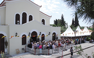 Στις ουρές με σουβλάκια αλλά και παγωμένα νερά δεκάδες προσκυνητές στο προαύλιο του ναού