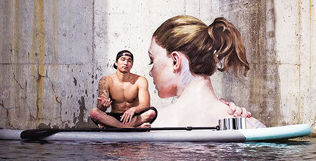 Είναι γνωστός street artist, ωστόσο τα πιο εντυπωσιακά έργα του «αναδύονται» από το νερό. Ο γεννημένος στη Χαβάη ζωγράφος Σιν Γιόρο, γνωστός και ως Hula, είναι ο άνθρωπος που κρατώντας ισορροπία πάνω σε μια σανίδα του σερφ, στην οποία ίσα ίσα που χωράει, αφού τη μοιράζεται με τα χρώματά του, σχηματίζει σε τοίχους κτιρίων που έχουν μισοβυθιστεί και εγκαταλειφθεί εντυπωσιακές γυναικείες μορφές, που τόσο πολύ μοιάζουν με την Αντζελίνα Τζολί.