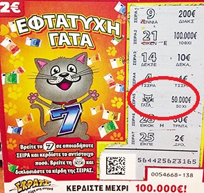 Αφού εκπλήρωσε το τάμα του και λίγο πριν πάρει το πλοίο της επιστροφής για τον Πειραιά, ο ίδιος έκανε στάση στο πρακτορείο του ΟΠΑΠ επί της λεωφόρου Δημοκρατίας, όπου αγόρασε το ΣΚΡΑΤΣ της σειράς Εφτάτυχη Γάτα. Αρχισε το ξύσιμο και τελικά διαπίστωσε πως ο άγιος είχε κάνει το «θαύμα» του και του είχε «δώσει» ένα δελτίο που κέρδιζε το ποσό των 100.000 ευρώ. Οπως ήταν φυσικό, στο πρακτορείο του ΟΠΑΠ εκτυλίχθηκαν απίστευτες σκηνές, με τον ηλικιωμένο να πανηγυρίζει έξαλλα και να δηλώνει έτοιμος να επιστρέψει στο σπίτι του ακόμη και κολυμπώντας!