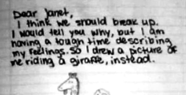 Το σκίτσο ενός άντρα πάνω σε μια χαρούμενη καμηλοπάρδαλη που κάνει σούζες μπορεί να μοιάζει χαριτωμένο με την πρώτη ματιά, όμως σίγουρα η παραλήπτριά του δεν ευθύμησε διαβάζοντας τη λεζάντα που το συνόδευε. «Αγαπητή Τζάνετ, νομίζω ότι πρέπει να χωρίσουμε. Θα σου έλεγα γιατί, αλλά δυσκολεύομαι να εκφράσω τα συναισθήματά μου, έτσι αντ’ αυτού σου ζωγράφισα ένα σκίτσο με εμένα να ιππεύω μια καμηλοπάρδαλη. Συγγνώμη» έγραφε χαρακτηριστικά.
