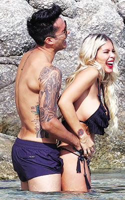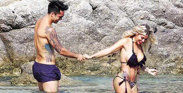 Ο φακός των παπαράτσι «αιχμαλώτισε» το ζευγάρι να ερωτοτροπεί σε παραλία του νησιού των ανέμων. Ο 30χρονος ποδοσφαιριστής, ο οποίος αγωνίζεται από το 2011 στο Ντουμπάι, στην ομάδα Al Ahli, και η εκρηκτική ξανθιά σύζυγός του φαίνονταν πολύ ερωτευμένοι, σαν να γνωρίστηκαν μόλις χθες. Εκείνος δεν έχανε την ευκαιρία να την πειράξει και να την κλείσει στην αγκαλιά του, ενώ εκείνη τού έκανε νάζια και γελούσε δυνατά.