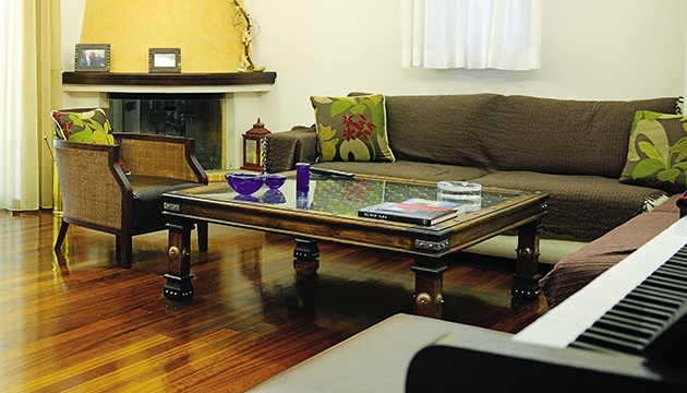 Η μικρή μαρμάρινη σκάλα απέναντι από το σαλόνι οδηγεί σε ένα μικρό φωτεινό γραφείο με φόντο τις ανθισμένες βουκαμβίλιες της. «Εδώ ηρεμώ, ενημερώνομαι από το ίντερνετ και διαβάζω» λέει καθώς μας ξεναγεί.