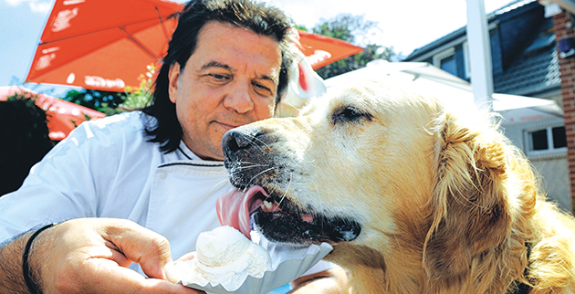 Με κλειστά τα μάτια από την ευχαρίστηση ο Οσκαρ γλείφει το παγωτό που του προσφέρει ο Λεονάρντο Καπραρέζε, Ιταλός παρασκευαστής παγωτών με έδρα στη Γερμανία, ο οποίος είχε την ιδέα να δημιουργήσει παγωτό ειδικά για σκύλους.