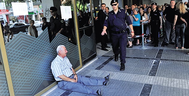 Σε απόγνωση, καθώς έχει πάει ήδη σε τρεις τράπεζες χωρίς να μπορέσει να πάρει τα 120 ευρώ, ξεσπά σε λυγμούς, με αποτέλεσμα να σπεύσουν να τον βοηθήσουν ένας αστυνομικός και άλλος ένας άντρας, πιθανότατα υπάλληλος της τράπεζας. «Να τα χάλια μας. Δουλέψαμε σε ανθυγιεινές δουλειές και σήμερα κοίτα την κατάντια μας» ήταν τα λόγια του προτού τον αιχμαλωτίσει ο φωτογραφικός φακός την ώρα που λύγιζε.