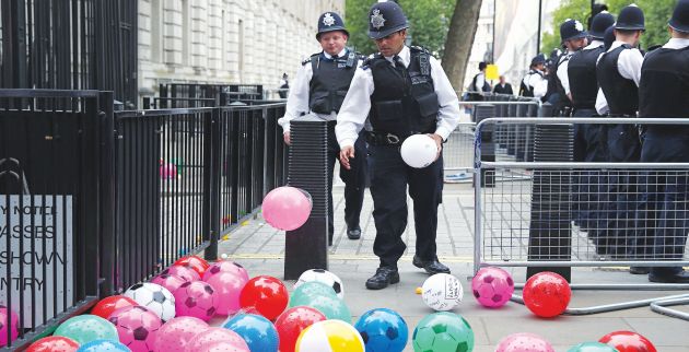 Αν μη τι άλλο οι διαφωνούντες με τις περικοπές στις κοινωνικές δαπάνες βρήκαν πρωτότυπο τρόπο να διαμαρτυρηθούν εναντίον της κυβέρνησης Κάμερον στη Βρετανία. Με την ευκαιρία της κατάθεσης του θερινού κομματιού του προϋπολογισμού, ο οποίος προβλέπει μείωση κοινωνικών δαπανών κατά 12.000.000.000 λίρες, δηλαδή σχεδόν 17.000.000.000 ευρώ, διαδηλωτές έριξαν δεκάδες πολύχρωμες μπάλες έξω από τον αριθμό 11 της Ντάουνινγκ Στριτ, όπου στεγάζονται η κατοικία και το γραφείο του εκάστοτε υπουργού Οικονομικών της χώρας.
