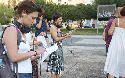 Από το υπαίθριο stand προμηθευόμαστε ακουστικά και ένα χαρτί οδηγιών όπου ο κάθε θεατής υποβάλλεται σε μια διαφορετική δοκιμασία. Σε ένα από τα χαρτιά γράφει: «Βρες τον Ιερό Ναό του Αγίου Γεωργίου. Μπες μέσα, κάθισε και πάτα το κουμπί on στα ακουστικά. Ακουσε προσεκτικά την αφήγηση, άναψε ένα κερί και περίμενε». Περιμένοντας ήρθε ο Λάμπρος. Είναι ένας από τους οκτώ συνολικά πρωταγωνιστές της ιδιαίτερης αυτής παράστασης που έχει ως στόχο να ακούσουν οι θεατές οκτώ διαφορετικές και αληθινές ιστορίες ανθρώπων που έζησαν στο πεζοδρόμιο, να συνομιλήσουν μαζί τους και να ευαισθητοποιηθούν κοινωνικά.