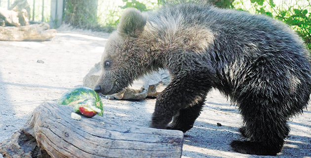 Επειδή πρέπει σιγά σιγά να μάθει να βρίσκει μόνος την τροφή του, τα φρούτα αφήνονται στον περιφραγμένο χώρο όπου μεγαλώνει, ώστε το αρκουδάκι να ψάξει να τα βρει.