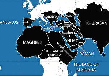 Ο «μαύρος» χάρτης που απεικονίζει τα όρια του Χαλιφάτου, όπως το οραματίζονται οι τζιχαντιστές, περιλαμβάνει όλη την Ασία από το Αιγαίο ως τα σύνορα με την Κίνα, τη βόρεια και κεντρική Αφρική, ενώ στην