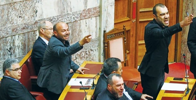Σε πεδίο μάχης μετατράπηκε το Κοινοβούλιο με σφοδρή κόντρα και απίστευτους χαρακτηρισμούς από τους βουλευτές της Χρυσής Αυγής κατά του ΣΥΡΙΖΑ και του Αλέξη Τσίπρα και τανάπαλιν. Ο βουλευτής του Νίκου Μιχαλολιάκου Παναγιώτης Ηλιόπουλος επιτέθηκε φραστικά κατά του κ. Τσίπρα λέγοντας «ο μίστερ Αλέξης κοιμάται τον ύπνο του δικαίου και περιμένει να γίνει πρωθυπουργός». Αμεση ήταν η αντίδραση του αντιπροέδρου της Βουλής Ιωάννη Δραγασάκη, ο οποίος διέταξε την αποβολή του βουλευτή της Χρυσής Αυγής από την αίθουσα της Ολομέλειας, καθώς κρίθηκε ότι ο κ. Ηλιόπουλος χρησιμοποίησε υβριστικές εκφράσεις για τη λειτουργία του θεσμού του κοινοβουλευτικού ελέγχου και το πρόσωπο του αρχηγού της αξιωματικής αντιπολίτευσης Αλέξη Τσίπρα.