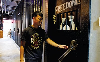 Οταν οι πελάτες θελήσουν να φύγουν δεν υπάρχει περίπτωση να μη βρουν την έξοδο. Στην πόρτα είναι ζωγραφισμένος ένας φυλακισμένος πίσω από τα κάγκελα και με μεγάλα γράμματα γράφει τη λέξη «ελευθερία». Το πόμολο μοιάζει με γαλλικό κλειδί, σαν αυτά που στις ταινίες του Χόλιγουντ χρησιμοποιούν οι κρατούμενοι για να το σκάσουν.