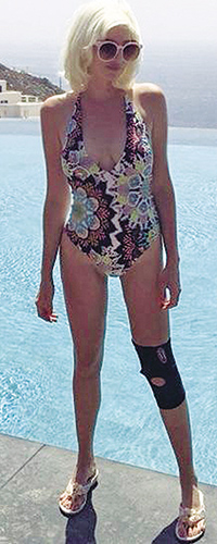 Επίσης την είδαμε νωχελικά ξαπλωμένη σε μια τεράστια πολυθρόνα-έργο τέχνης να απολαμβάνει τα δροσερά κοκτέιλ της σε hot στέκια του νησιού, να ποζάρει δίπλα σε πισίνα, ενώ εντυπωσιαστήκαμε από την εμφάνισή της… by the pool, φορώντας επιγονατίδα στο αριστερό πόδι της.