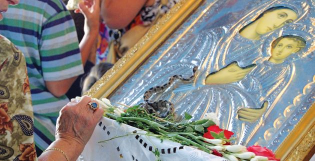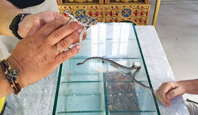 Τα μικρά ερπετά, τα οποία είναι εντελώς ακίνδυνα, φέρουν μικρούς μαύρους σταυρούς στο κεφάλι και στη γλώσσα τους, και εμφανίζονται κάθε χρόνο από τις 6 έως τις 15 Αυγούστου. Οι κάτοικοι των δύο χωριών τα μαζεύουν από τους δρόμους για να μην ποδοπατηθούν, τα βάζουν σε βάζα και τα πηγαίνουν στην εκκλησία.