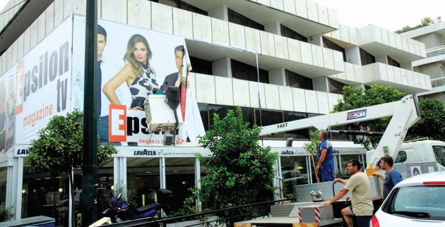 Με καθυστέρηση δύο και βάλε χρόνων κατέβηκαν χθες το πρωί οι τεράστιες γιγαντοαφίσες του τηλεοπτικού σταθμού Ε, που κάλυπταν την πρόσοψη κτιρίου πλησίον του Καλλιμάρμαρου