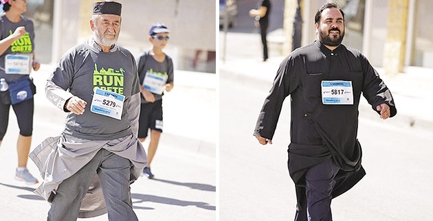 Εβαλαν πάνω από τα ράσα το t-shirt «Run Crete» και έτρεξαν στον ημιμαραθώνιο που έγινε στο Αρκαλοχώρι Ηρακλείου δύο ιερείς, την Κυριακή 2 Οκτωβρίου. Ο εφημέριος του Ιερού Ναού Αγίου Αντωνίου Πατσίδερου Εμμανουήλ Κοσιδεκάκης και ο ιερέας της Μητρόπολης Αρκαλοχωρίου Μιχαήλ Παπαϊωάννου ήταν η έκπληξη του αγώνα των πέντε χιλιομέτρων, αφού μαγνήτισαν τα βλέμματα όλων όσοι παρακολουθούσαν τον ημιμαραθώνιο, αλλά και εκείνων που έτρεξαν μαζί τους και τους θαύμασαν για τη θέληση και την αντοχή τους. Στο τέλος της διαδρομής εισέπραξαν και οι δύο πολλά χειροκροτήματα.