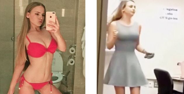 Στο βιντεάκι που έχουν τραβήξει οι μαθητές της και έχει γίνει viral, η ξανθιά νεαρή γυναίκα εμφανίζεται να φορά ένα αμάνικο γκρι φόρεμα και σανδάλια και να απευθύνεται με ύφος σοβαρό στην τάξη, πριν τους γυρίσει την πλάτη για να γράψει τις εξισώσεις.