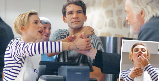 Με μεγάλη διάθεση εξυπηρέτησης και κατεβάζοντας μεγάλες μπουκιές, η Σκάρλετ Γιόχανσον υποδέχθηκε τους πελάτες που είχαν σχηματίσει ουρά έξω από το κατάστημα που άνοιξε με τον σύζυγό της Ρομέν Ντοριάκ