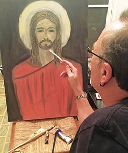 «Δεν γνώριζα πως διέθετα τέτοιο ταλέντο. Χαίρομαι που το ανακάλυψα και μπορώ να δίνω “ζωή” σε έναν λευκό άδειο καμβά» λέει ο λαϊκός ερμηνευτής, που ανακατεύει τα χρώματα της παλέτας του, καθώς ολοκληρώνει ένα ακόμη έργο του, με θέμα τη Σταύρωση του Χριστού. Εναν πίνακα γεμάτο πόνο και δάκρυα.