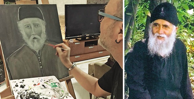 Οι προσωπογραφίες του είναι λιτές, με χαρακτηριστικό την ηρεμία στο βλέμμα. «Οταν ολοκλήρωσα τα πρώτα μου έργα, τα παρουσίασα σε λίγους και καλούς μου φίλους. Ολοι αναγνώρισαν σε ένα από τα πρόσωπα τον άγιο Παΐσιο, τη μορφή του οποίου δεν είχα δει πoτέ μέχρι τότε» συμπληρώνει ο τραγουδιστής, που λέει πως όταν ξεκίνησε να σχεδιάζει τον συγκεκριμένο πίνακα δεν είχε ιδέα τι ήθελε να ζωγραφίσει.