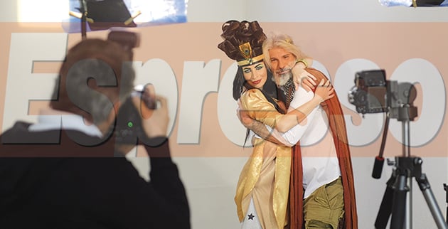 Μία ώρα μετά τη Νένα Χρονοπούλου πήραν θέσεις στο stage και άλλοι καλλιτέχνες που είπαν το «ναι» στην πρόταση του Γιώργου Σαρρή. Μεταξύ αυτών ήταν και ο Μάνος Πίντζης, που μεταμορφώθηκε σε Ιούλιο Καίσαρα, έχοντας δίπλα του τη συνάδελφό του ηθοποιό Αλίκη Βουτζουράκη, η οποία φωτογραφήθηκε ως Κλεοπάτρα.