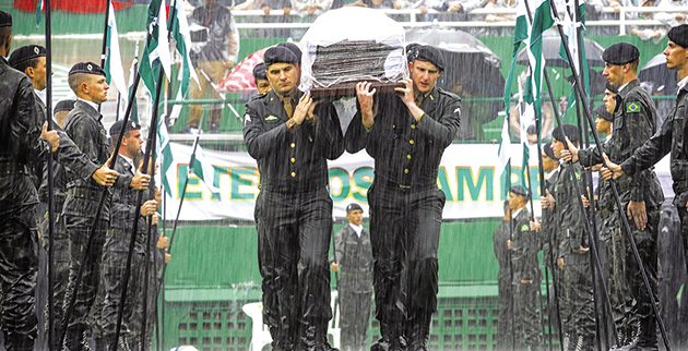 Τα φέρετρα των 50 μελών – 19 παικτών-, προπονητών, παραγόντων της Σαπεκοένσε, που έχασαν τη ζωή τους στο αεροπορικό δυστύχημα της περασμένης Τρίτης στην Κολομβία, τοποθετήθηκαν στο χορτάρι του Arena Conda της μικρής πόλης Σαπέκο. Και οι οικογένειές τους, μαζί με 20.000 οπαδούς της ομάδας, είπαν υπό τη βροχή το τελευταίο «αντίο» στους αγαπημένους τους, ενώ ακόμη και οι στρατιώτες που μετέφεραν τα φέρετρα ξέσπασαν σε λυγμούς.