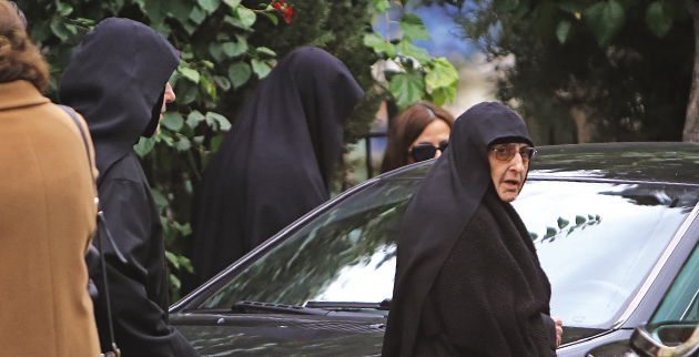 Αποφεύγοντας τους φωτογράφους και τις κάμερες με κινηματογραφικό τρόπο φυγαδεύτηκε από τον ιερό ναό, μέσα σε μια Mercedes. Την ώρα που μια κυρία ζητούσε από τους φωτογράφους να απομακρυνθούν, απασχολώντας τους εντέχνως, μια ανθρώπινη ασπίδα βοήθησε τη νεαρή μοναχή να μπει στο αυτοκίνητο με αστραπιαίες κινήσεις. Είχε νωρίτερα φτάσει στον ναό από την πλαϊνή πόρτα, συνοδευόμενη από καλόγριες της μονής της Εύβοιας όπου έχει αφιερωθεί. Δέχτηκε στωικά και με αγάπη τα συλλυπητήρια του κόσμου, που δεν ξεπέρασαν τα 50 με 60 άτομα. Μάλιστα, η νεαρή καλόγρια, η οποία τραβούσε συνεχώς το μαντίλι χαμηλά κρύβοντας τα μάτια της, μοιάζει εκπληκτικά στη μητέρα της, η οποία έφυγε πέρυσι από τη ζωή νικημένη από τον καρκίνο.