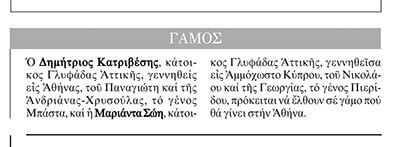 «Ο Δημήτριος Κατριβέσης, κάτοικος Γλυφάδας Αττικής, γεννηθείς εις Αθήνας, του Παναγιώτη και της Ανδριάνας Χρυσούλας, το γένος Μπάστα, και η Μαριάντα Σώη,
