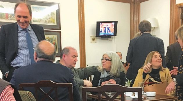 ■ «Συλλάβαμε» την κομψή Κατερίνα Μάρκου να συζητά με συναδέλφους της από την κεντροαριστερή πτέρυγα για τις πολιτικές εξελίξεις της περιόδου.