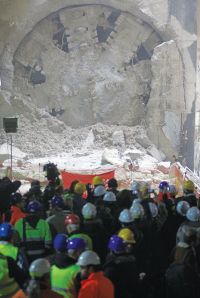 Το τοιχίο εισόδου στον σταθμό, στον οποίο ήταν αναρτημένη μια ελληνική σημαία, γκρεμίστηκε και πίσω από τόνους χώματος ξεπρόβαλε ο μετροπόντικας «Ηρακλής». Η είσοδός του στον σταθμό συνοδεύτηκε από χειροκροτήματα και επιφωνήματα χαράς από τους χειριστές του τεράστιου μηχανήματος.