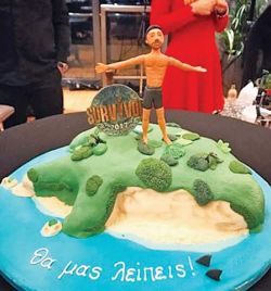 Το πάρτι το βράδυ του Σαββάτου σε κεντρικό αθηναϊκό ξενοδοχείο μετατράπηκε σε προ-γαμήλιο γλέντι με σαμπάνιες, σούσι και άλλες γιαπωνέζικες λιχουδιές, ενώ εντυπωσιακή ήταν η τούρτα. Σε αυτήν ο παρουσιαστής είχε γίνει φιγούρα καρτούν φορώντας το μαγιό του και «πατώντας» πάνω στο γλύκισμα-νησί της Καραϊβικής, με φόντο το σήμα του «Survivor 2017».