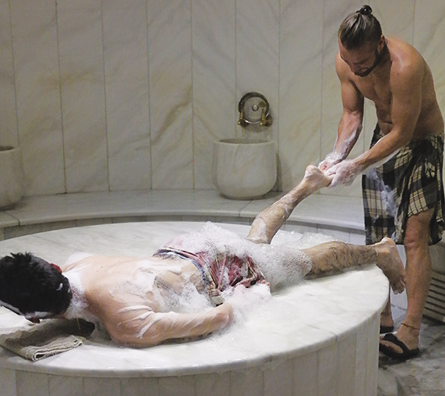 Κορμιά ιδρωμένα που διακρίνονται σαν οντότητες μέσα από τους υδρατμούς με τις φυσαλίδες του σαπουνιού να φλερτάρουν με τον αχνό φωτισμό, οι πελάτες του Hammam Baths απολαμβάνουν στιγμές τελετουργικές.