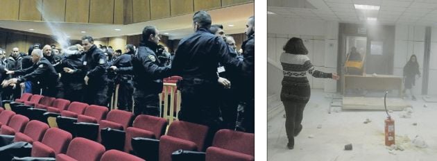 Εισβολή αντιεξουσιαστών στη δίκη της Χ.Α.! Αγρια επεισόδια με σπασμένα γραφεία, μπουκάλια και… πυροσβεστήρες πριν από την παρέμβαση των ΜΑΤ!