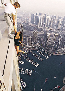 Σε μια ασυνήθιστη ημέρα φωτογράφισης, όμως, ακροβατεί επικίνδυνα σε ύψη δυσθεώρητα όσο η κορυφή των 73 ορόφων (305 μέτρα) του Πύργου του Ντουμπάι, του υψηλότερου ουρανοξύστη του κόσμου, ή του Πύργου της Σανγκάης και της Γκανγκτσού, αναδεικνύοντας την τόλμη της.