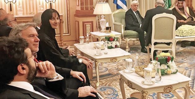 Με μαύρη κελεμπία και καλυμμένα τα μαλλιά της, η Ελληνίδα υπουργός παρακάθισε στο γεύμα που παρέθεσε ο βασιλιάς της Σαουδικής Αραβίας Σαλμάν μπιν Αμπντουλαζίζ αλ Σαούντ, προς τιμήν του Προέδρου της Ελληνικής Δημοκρατίας Προκόπη Παυλόπουλου, τον οποίο συνόδευε η Ελενα Κουντουρά.