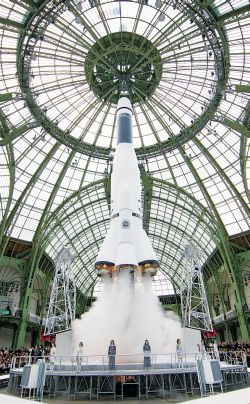 Η επιλογή του concept από τον μεγαλύτερο οίκο ειδών πολυτελείας στον κόσμο, ο οποίος φημίζεται για τα πολύ ιδιαίτερα σενάρια των επιδείξεών του, δεν ήταν τυχαία, καθώς χθες τα ξημερώματα από το κέντρο εκτόξευσης της Ευρωπαϊκής Διαστημικής Υπηρεσίας στη γαλλική Γουιάνα έγινε η επιτυχής εκτόξευση του πυραύλου «Vega», που έθεσε σε τροχιά έναν δορυφόρο παρατήρησης.