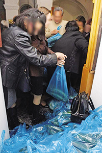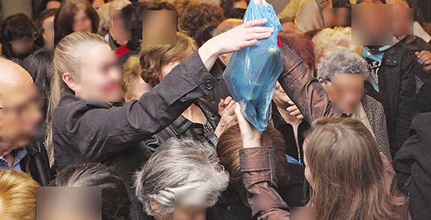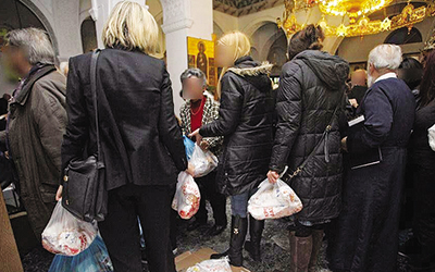 Τα προϊόντα ήταν τοποθετημένα σε ξεχωριστά σημεία μέσα στην εκκλησία και αυτό που προκάλεσε μεγαλύτερη εντύπωση δεν ήταν η τεράστια ουρά μπροστά από τις σακούλες για το κρέας, αλλά η μάχη που δόθηκε για μια σακούλα που περιείχε μόνο αγγούρια!