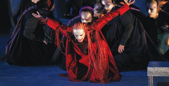 Φορώντας ένα κόκκινο -θεατρικό τύπου- φόρεμα και μάσκα, η οποία κάλυπτε το μισό πρόσωπό του και κατέληγε σε επίσης κόκκινα, πολύ μακριά μαλλιά, ο Γιώργος Κιμούλης παρουσίασε τη δική του εκδοχή της γνωστή τραγωδίας του Ευριπίδη.