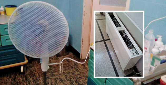 Μέσα από μια σειρά φωτογραφιών, που αποκαλύπτουν ότι ολόκληρες κλινικές και τμήματα έχουν μείνει χωρίς κλιματισμό, με τα κλιματιστικά μηχανήματα διαλυμένα, η Πανελλήνια Ομοσπονδία Εργαζομένων Δημόσιων Νοσοκομείων (ΠΟΕΔΗΝ) αναδεικνύει το τεράστιο πρόβλημα που θα αντιμετωπίζουν έως την Κυριακή όσοι βρίσκονται σε αυτά, οι οποίοι θα αναγκαστούν να παλέψουν με τον καύσωνα χρησιμοποιώντας ανεμιστήρες και βεντάλιες!