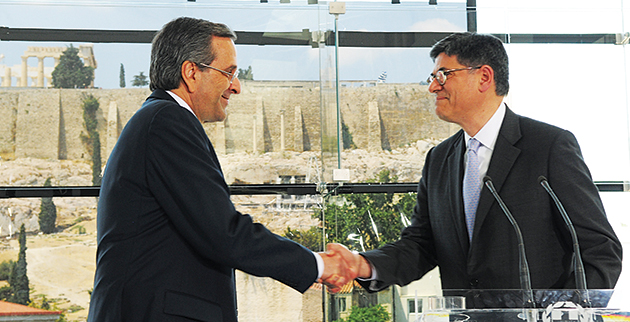 Χθες έφθασε στην Αθήνα το δεξί χέρι του Ομπάμα, ο 57χρονος υπουργός Οικονομικών των ΗΠΑ Τζακ Λιου. Ο Αμερικανός έρχεται αμέσως μετά την αναχώρηση Σόιμπλε και η παρουσία των δύο ισχυρότερων οικονομιών, των ΗΠΑ και της Γερμανίας, στην Αθήνα μόνο τυχαίο γεγονός δεν είναι. Υπενθυμίζεται ότι το ΔΝΤ επιθυμεί κούρεμα του ελληνικού χρέους και το Βερολίνο το αρνείται.