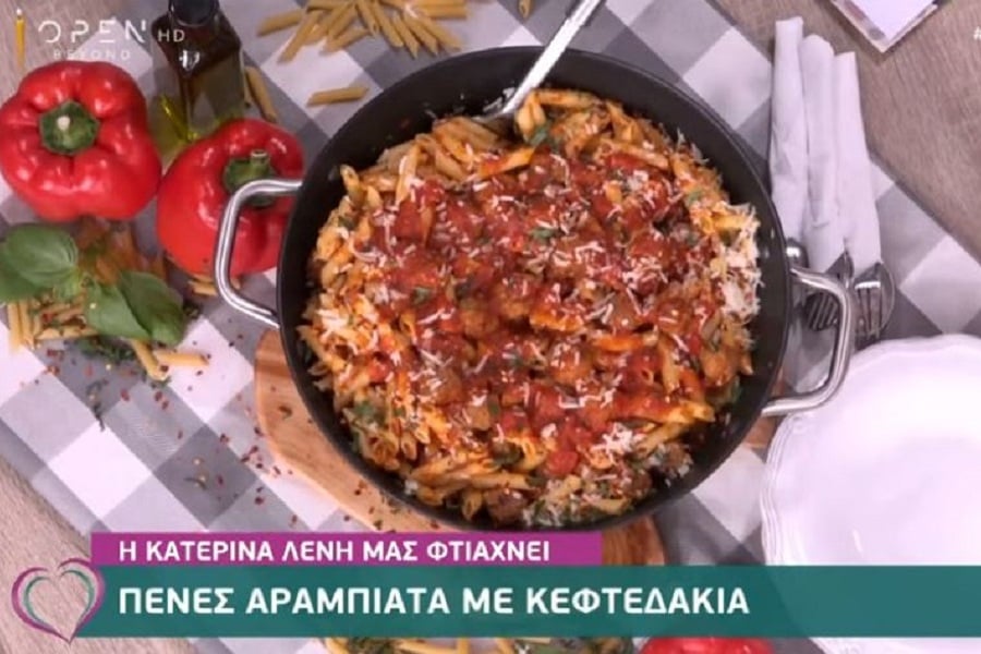 Η Κατερίνα Λένη έφτιαξε πένες αραμπιάτα με κεφτεδάκια στην εκπομπή «Ευτυχείτε». Δείτε τη συνταγή που ακολουθεί: