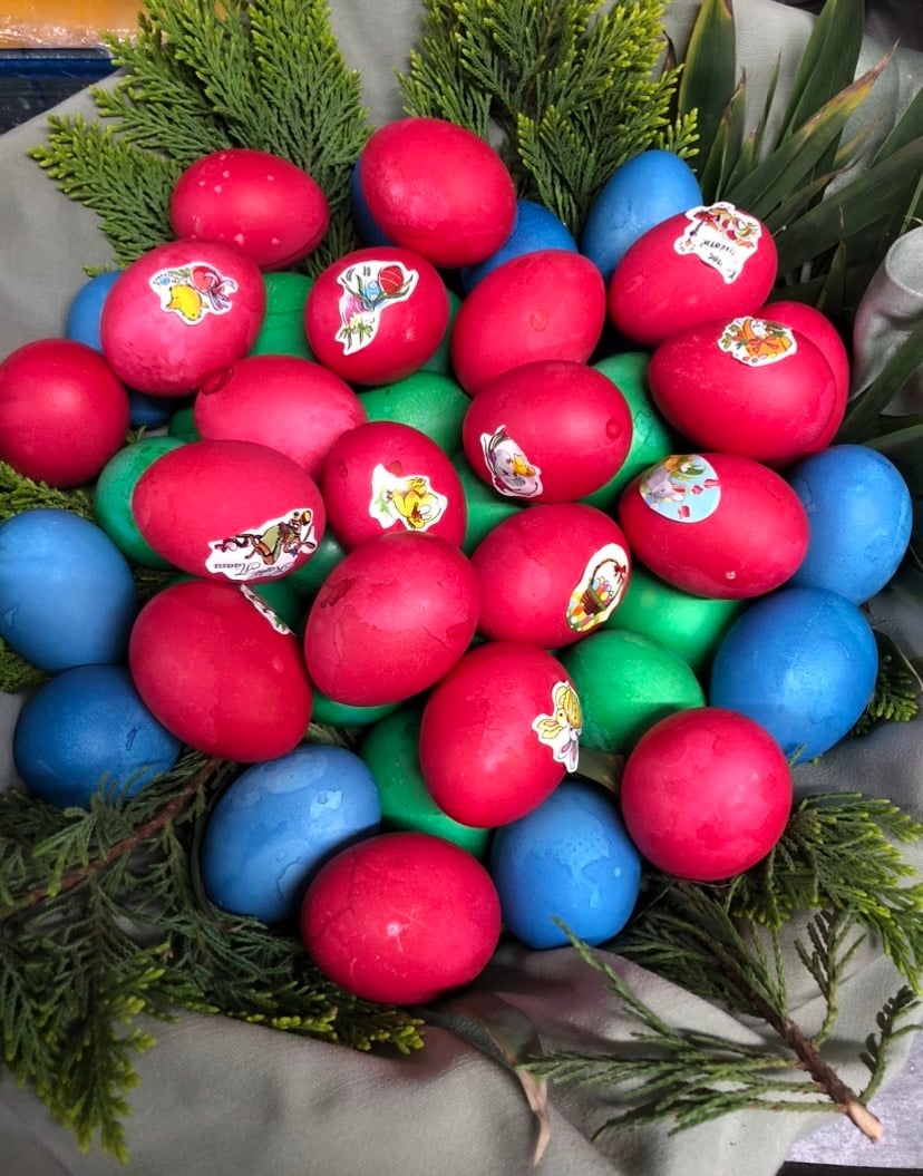 Τα αβγά βάφονται σε διάφορα χρώματα, αλλά τα πρωτεία κατέχει το κόκκινο. Τα κόκκινα αβγά τα μοιράζει κάθε κοινότητα, μετά την πασχαλινή θεία λειτουργία, στην ενορία της. Επίσης, τη Μεγάλη Πέμπτη ετοιμάζουμε τα υλικά, τη μαγιά για τα πασχαλινά τσουρέκια. Οι παλιές τα ζυμώνανε στη σκάφη, γιατί οι φαμίλιες τους ήταν μεγάλες. Τα ζυμώνανε καλά με τα χέρια, άφηναν τη ζύμη λίγο να συνέλθει, μετά έφτιαχναν τα πασχαλινά τσουρέκια εντός μαύρης λαμαρίνας και τα πήγαιναν στον φούρνο. Ολη η περιοχή μοσχομύριζε μαστίχα χιώτικη, μαχλέπι και κακουλέ (κάρδαμο), που τα έβαζαν στη ζύμη.